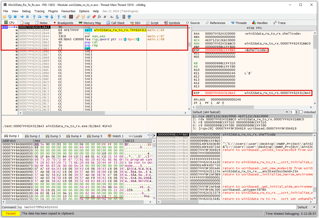 Throughout the entire execution—from the first NOP at offset 0 through the final RET at offset 5—the memory protection remained PAGE_READWRITE as confirmed by repeated checks of the Memory Map window. The .data section never transitioned to executable status. We never called VirtualProtect, never modified any memory protection flags, and never created RWX or RX pages. The technique is fully functional and demonstrates a genuine "bypass" of Windows' DEP/NX memory protection mechanisms by exploiting the timing of hardware breakpoint checks at the CPU level, which occur before the Memory Management Unit examines page permissions.